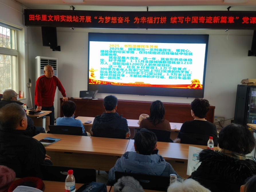 新区五老宣讲团张励军老师为社区党员授课,张老师从习近平总书记新年贺词中汲取“为梦想奋斗,为幸福打拼,续写中国奇迹新篇章”为主题,深入解读了习近平总书记二〇二六年新年贺词。他提到,新年贺词中深情回顾了“十四五”收官之年中国式现代化的奋进轨迹,激励着全党全国各族人民在“十五五”开局之年奋勇向前。张老师深入浅出地解读了贺词中的深刻内涵和精神实质。他指出,新年贺词回顾了过去一年国家取得的成就,展望了未来发展的美好蓝图,字里行间蕴含着对人民的深情关怀和对奋斗精神的大力弘扬。张老师强调,每个党员都应从贺词中汲取力量,将个人梦想与国家发展紧密相连,以奋斗姿态为幸福生活拼搏,为续写中国奇迹贡献力量。